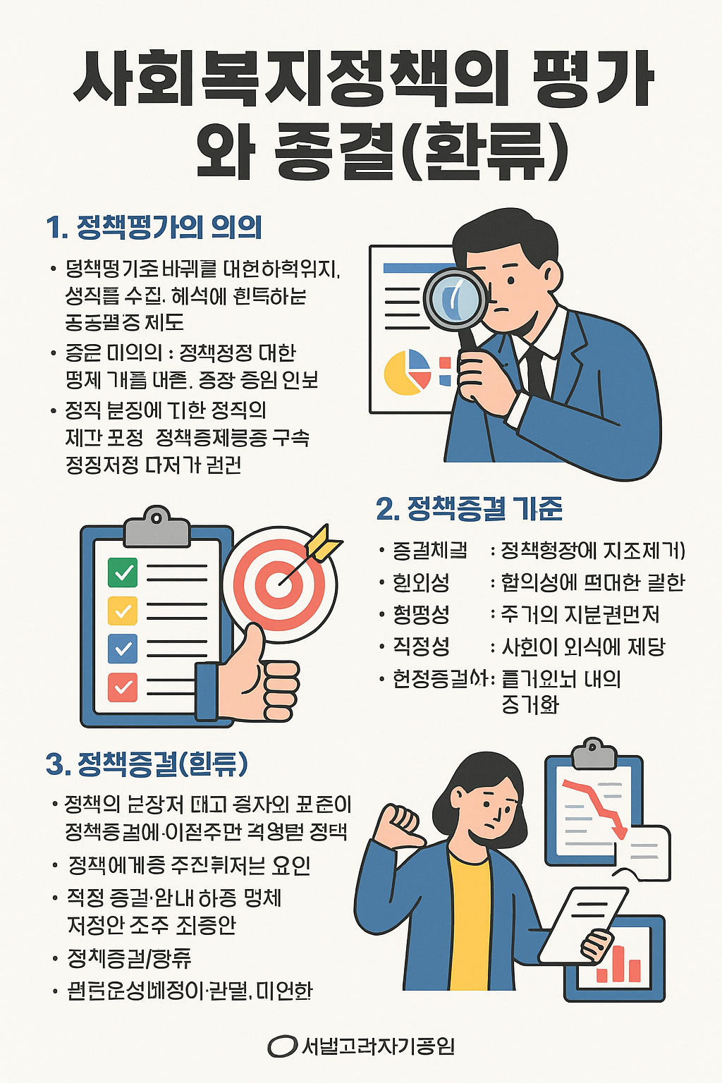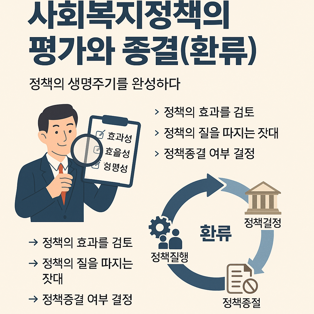 에서는 정책평가의 개념과 기준, 종결의 요인과 방식, 환류의 의미를 중심으로 사회복지정책의 후반부 단계를 자세히 살펴보겠습니다.