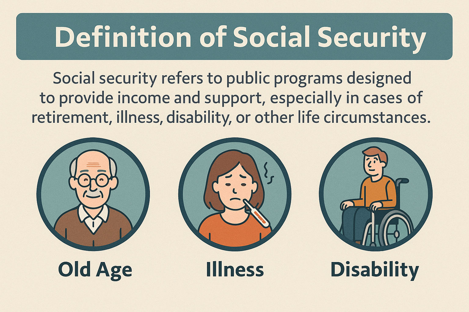 ILO는 사회보장을 “사회적 위험에 대응하여, 사회가 구성원에게 적절한 조직을 통해 제공하는 보장”으로 정의합니다. 질병, 실업, 고령, 장애, 사망 등 다양한 위기 상황에서 공공적 개입으로 개인을 보호하는 체계를 말합니다.